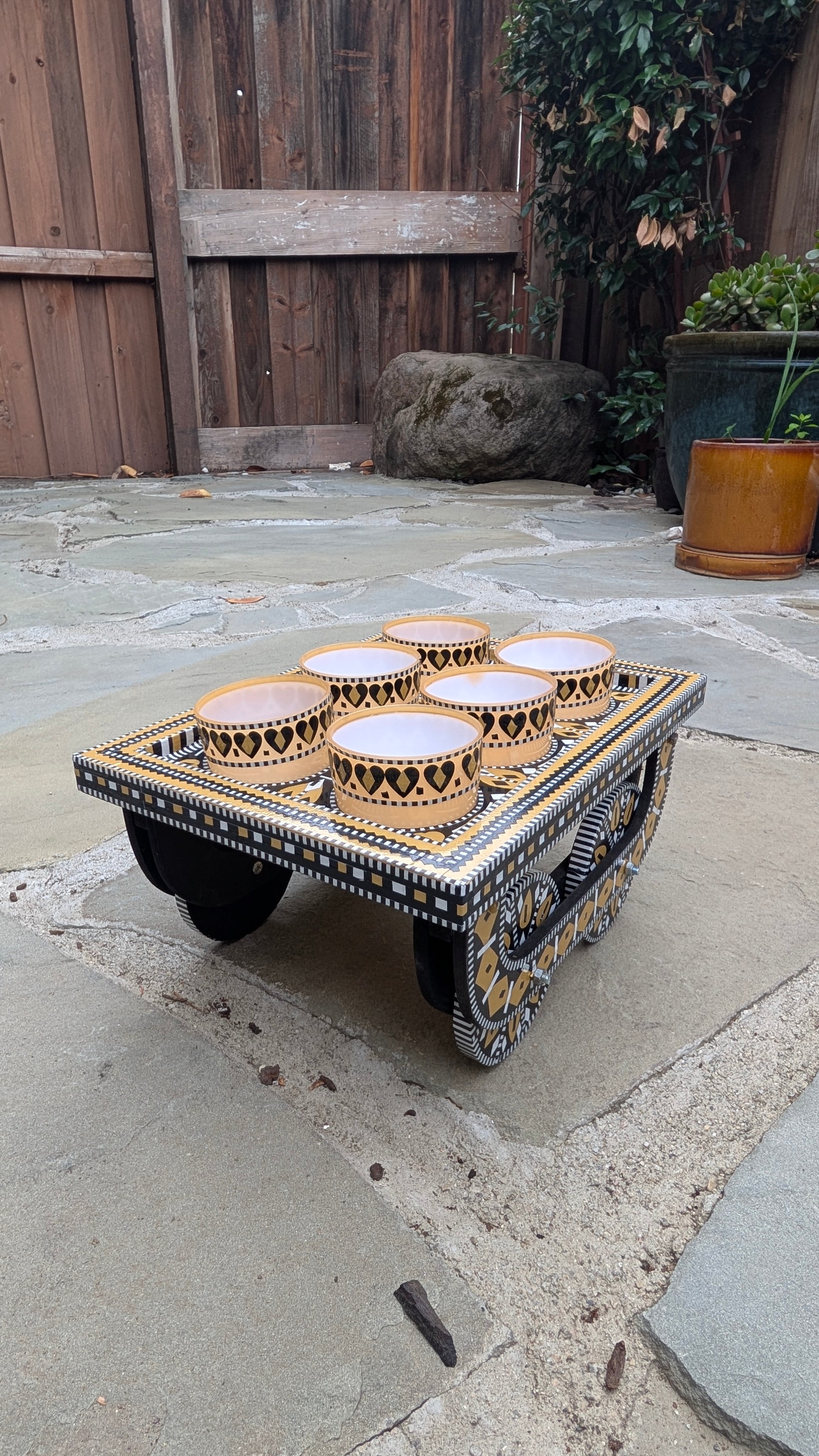 Wooden base with Traditional Chamakpatti (sticker art). Plastic cups can be used for cold beverages. But you can also replace them with your choice of paper cups for chai!